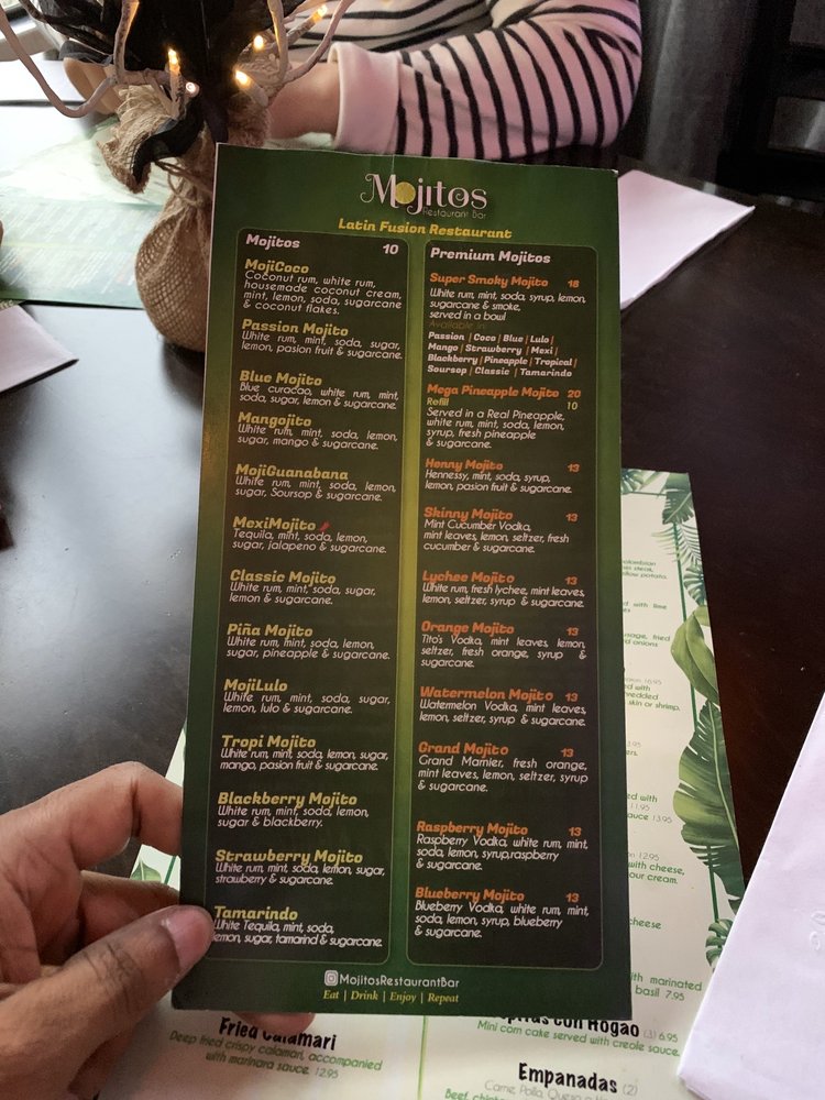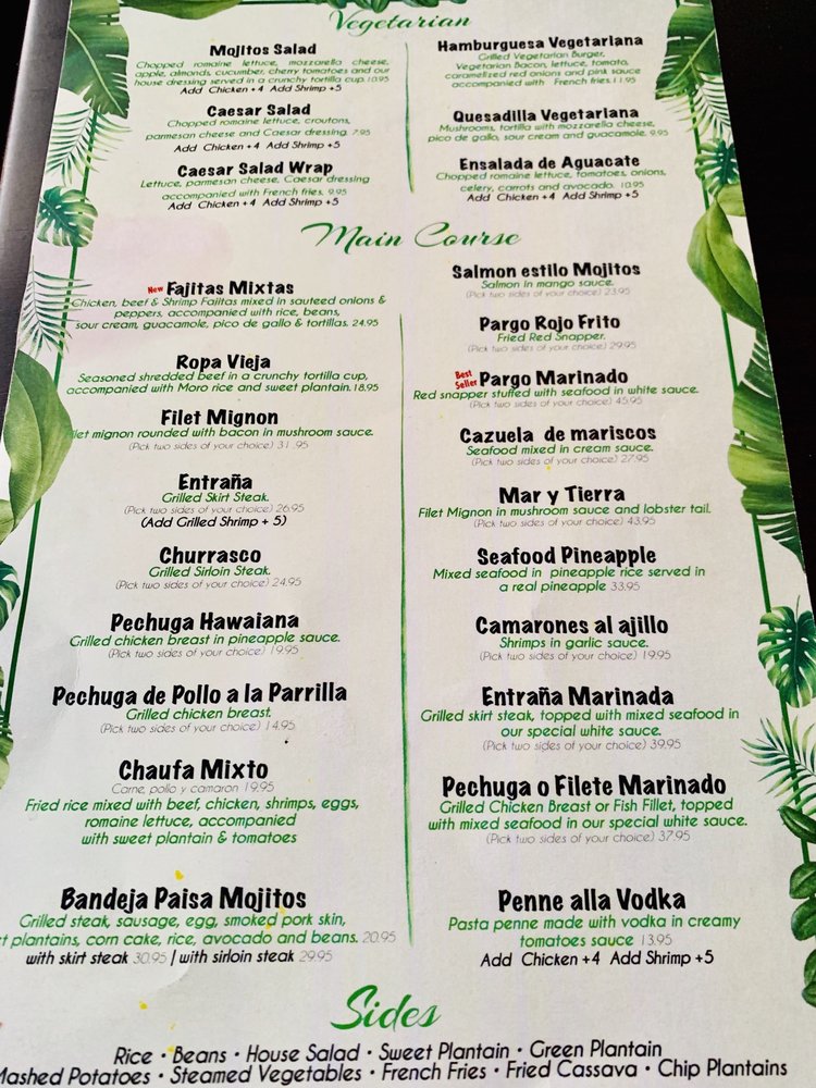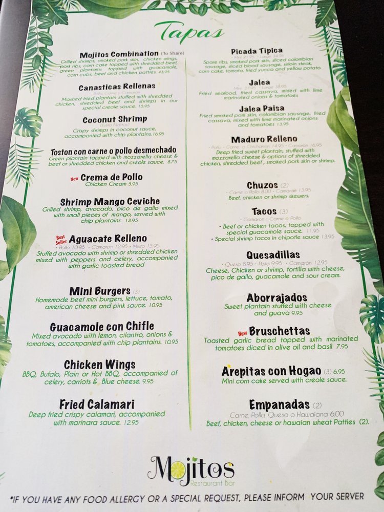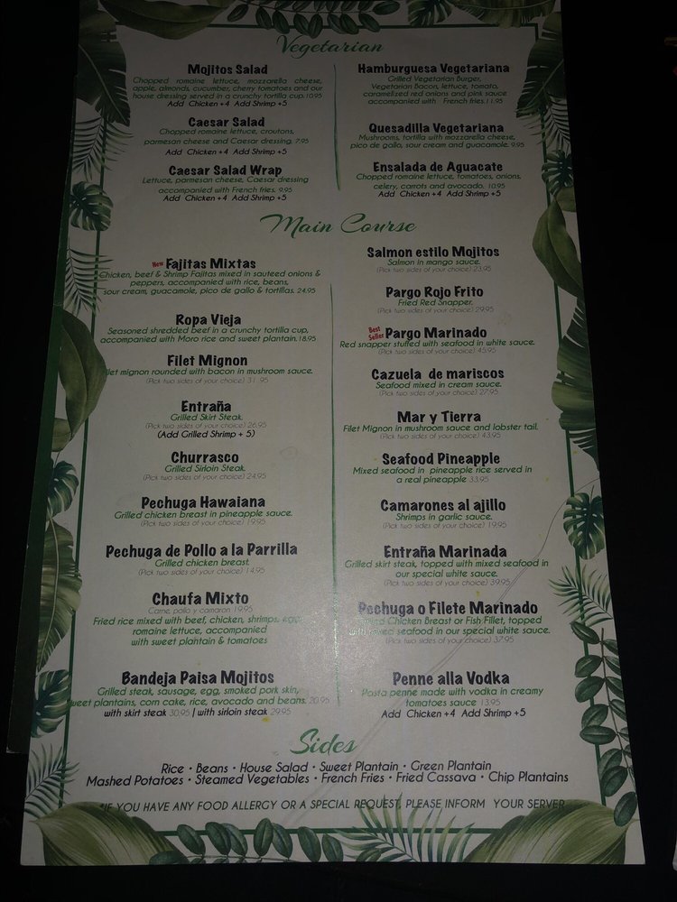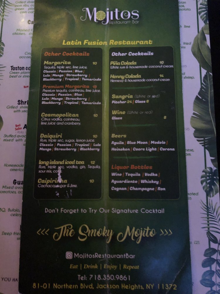 Welcome to Mojitos Restaurant Bar, a Latin American gem located in Jackson Heights, NY. This casual and intimate spot offers a diverse menu filled with delicious options for breakfast, brunch, and dinner. From their flavorful cocktails like Mojitos and Margaritas to their mouth-watering tapas such as Aguacate Relleno and Canasticas Rellenas, there's something for everyone to enjoy. In addition to their extensive bar menu, Mojitos Restaurant Bar also offers a wide range of main courses like Pargo Marinado and Cazuela de Mariscos. With amenities like outdoor seating, free Wi-Fi, and private dining options, this restaurant provides a unique dining experience for all. Don't miss out on their Happy Hour specials and best nights on Friday. Overall, Mojitos Restaurant Bar is a must-visit destination for a taste of Latin American cuisine with a twist.